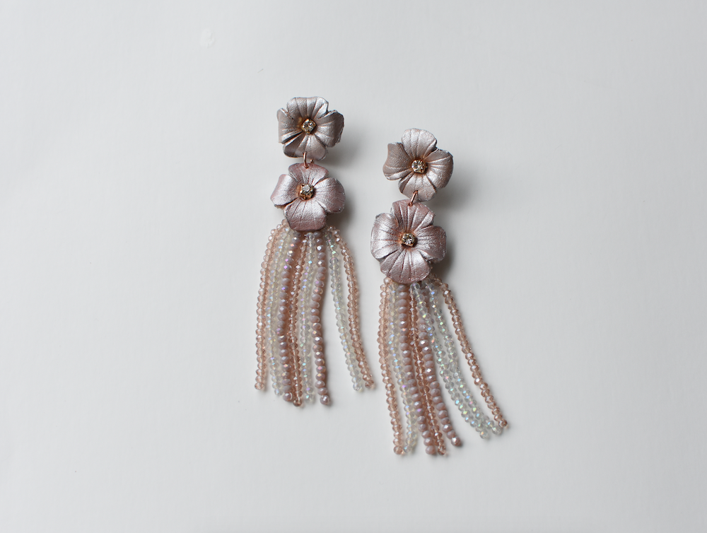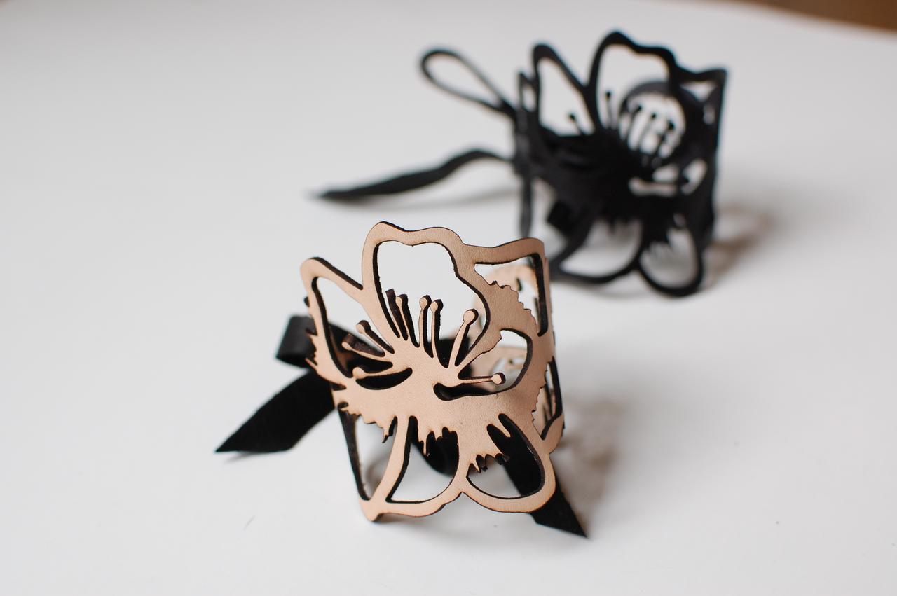 Inspired by flora and fauna, Sabrina creates each piece by hand, shaping leather into feminine forms and delicate pieces of wearable art. Our pieces are transformed with traditional techniques and cutting edge technology to capture the natural textures and the essence of the piece. We create our flowers and feather components like a couturier, shaping or cutting each piece from leather by hand, beading flowers with the utmost care, or hand painting each piece to create more dimension.